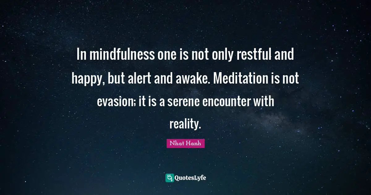 This page presents the quote "In mindfulness one is not only restful and happy, but alert and awake. Meditation is not evasion; it is a serene encounter with reality.". Author of this quote is Nhat Hanh. This quote is about reality, encounters, meditation, serene, happy, restful, mindfulness, awake, evasion,.