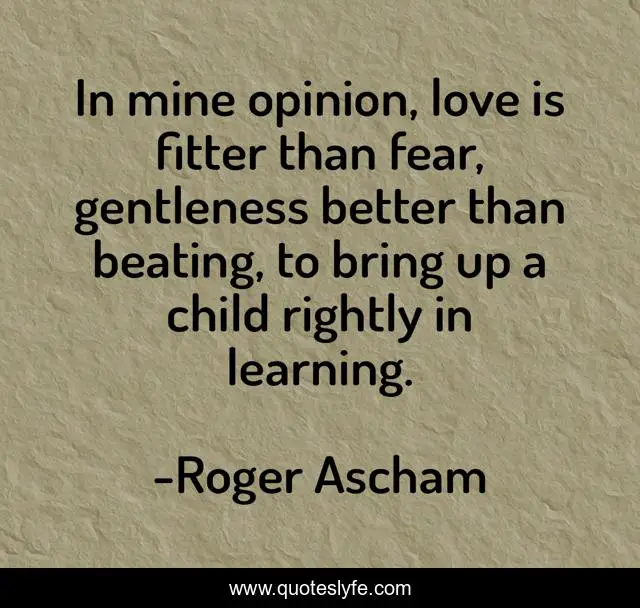 This page presents the quote "In mine opinion, love is fitter than fear, gentleness better than beating, to bring up a child rightly in learning.". Author of this quote is Roger Ascham. This quote is about fear, love, affection, love is,.