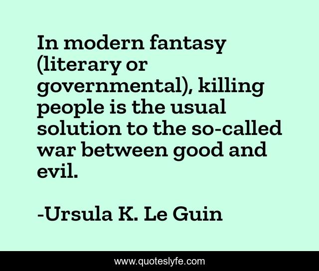 This page presents the quote "In modern fantasy (literary or governmental), killing people is the usual solution to the so-called war between good and evil.". Author of this quote is Ursula K. Le Guin. This quote is about good, war, evil,.
