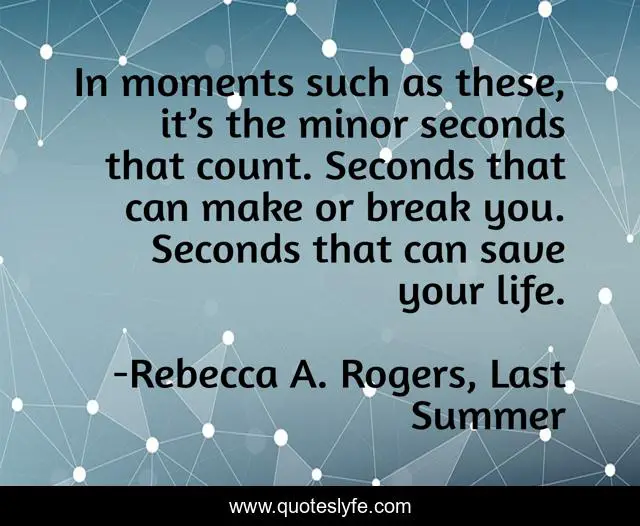 This page presents the quote "In moments such as these, it’s the minor seconds that count. Seconds that can make or break you. Seconds that can save your life.". Author of this quote is Rebecca A. Rogers, Last Summer. This quote is about moments, seconds, inspirational, enthusiasm,.