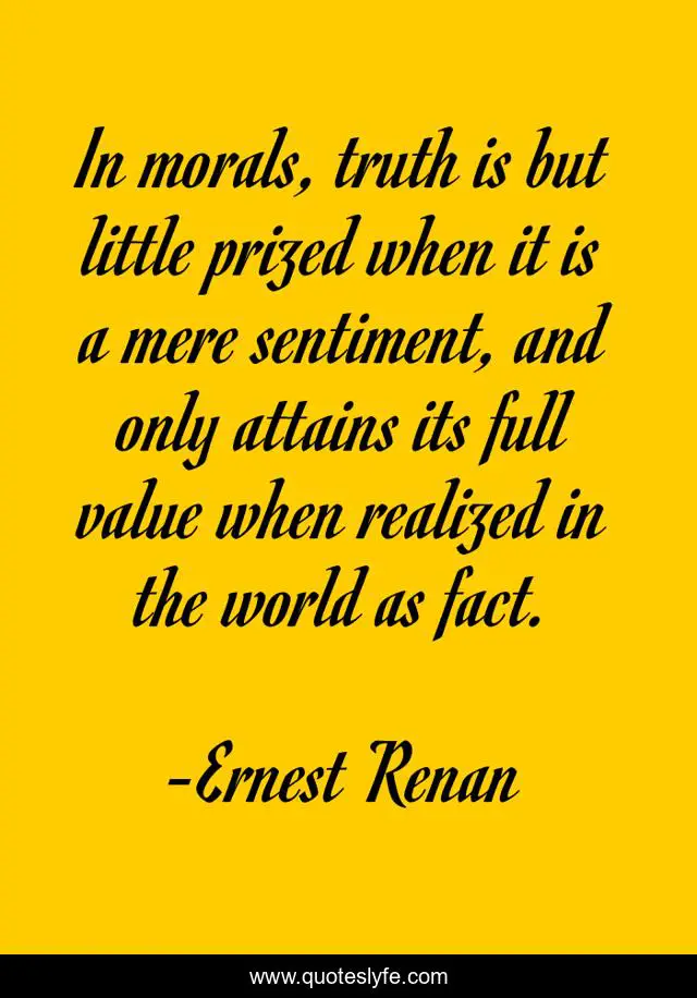 This page presents the quote "In morals, truth is but little prized when it is a mere sentiment, and only attains its full value when realized in the world as fact.". Author of this quote is Ernest Renan. This quote is about world, truth is, value,.