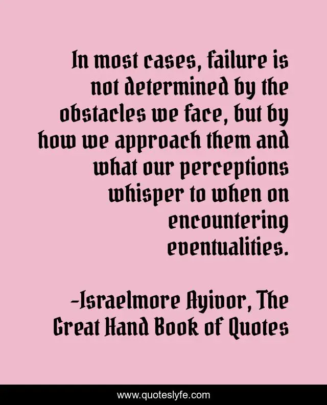 This page presents the quote "In most cases, failure is not determined by the obstacles we face, but by how we approach them and what our perceptions whisper to when on encountering eventualities.". Author of this quote is Israelmore Ayivor, The Great Hand Book of Quotes. This quote is about food-for-thought, eventualities, failed, whisper, failing, negative-thing, perceive, face, failure,.