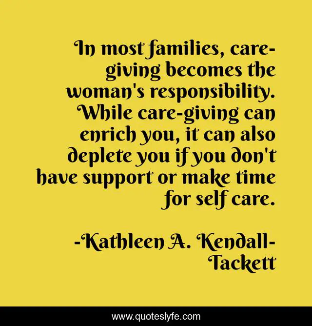 This page presents the quote "In most families, care-giving becomes the woman's responsibility. While care-giving can enrich you, it can also deplete you if you don't have support or make time for self care.". Author of this quote is Kathleen A. Kendall-Tackett. This quote is about motherhood, caregiving, self-care,.