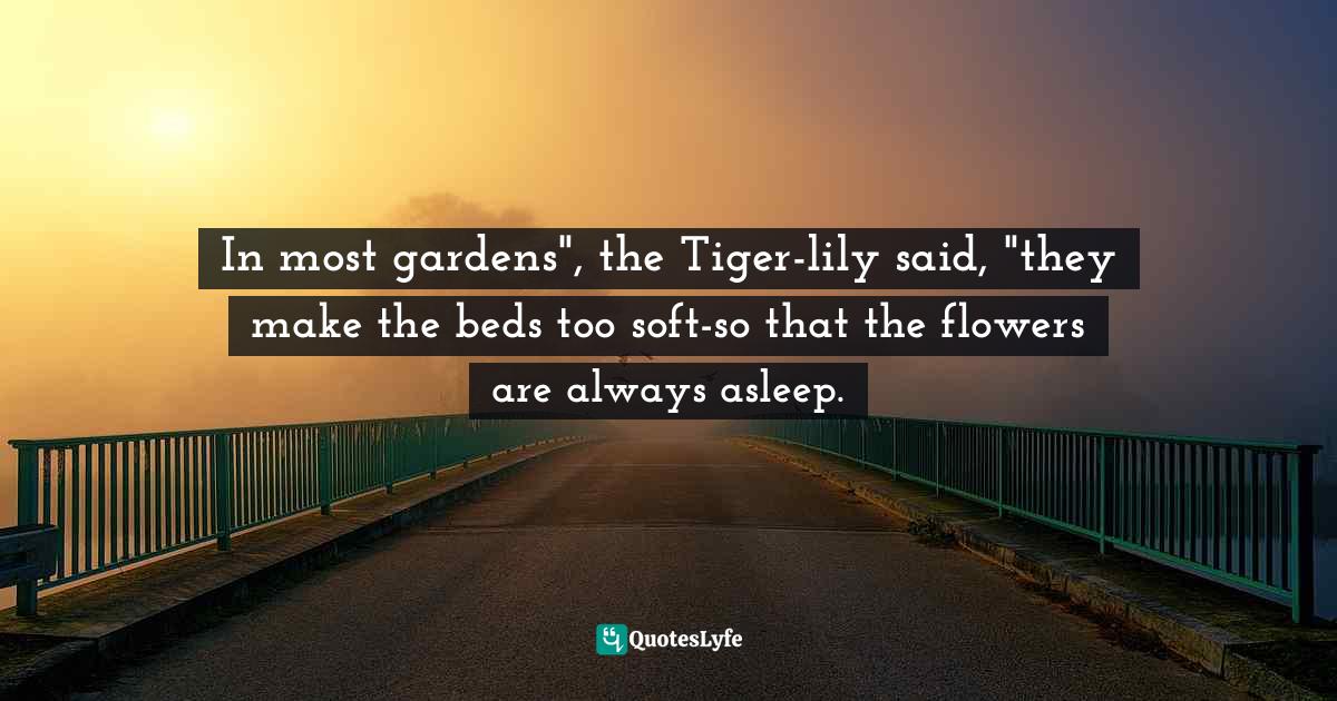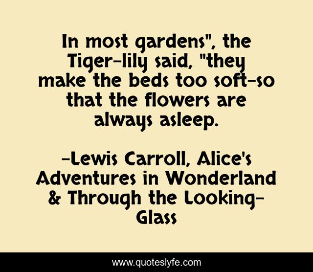 This page presents the quote "In most gardens", the Tiger-lily said, "they make the beds too soft-so that the flowers are always asleep.". Author of this quote is Lewis Carroll, Alice's Adventures in Wonderland & Through the Looking-Glass. This quote is about garden, looking-glass, alice, talking, wonderland, flowers,.