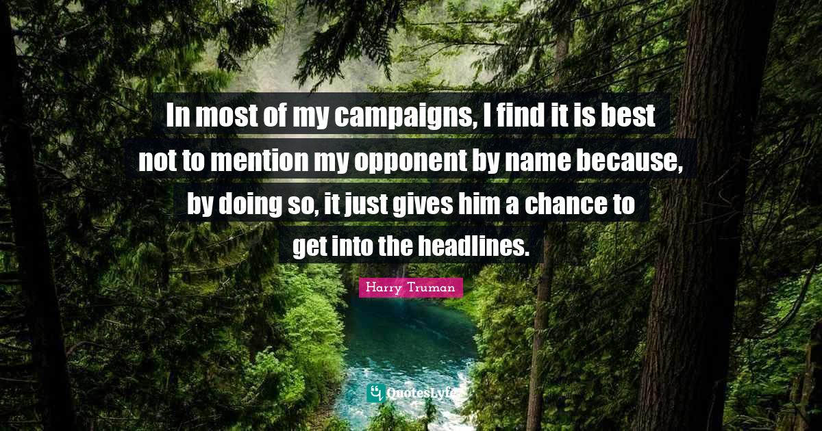 This page presents the quote "In most of my campaigns, I find it is best not to mention my opponent by name because, by doing so, it just gives him a chance to get into the headlines.". Author of this quote is Harry Truman. This quote is about politics, humor,.