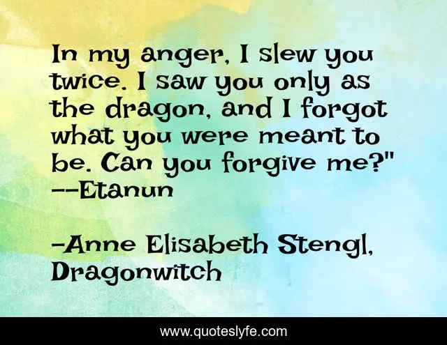 This page presents the quote "In my anger, I slew you twice. I saw you only as the dragon, and I forgot what you were meant to be. Can you forgive me?"--Etanun". Author of this quote is Anne Elisabeth Stengl, Dragonwitch. This quote is about love, dragons, fantasy, tales-of-goldstone-wood, forgiveness, affection,.