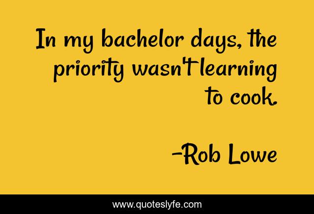 This page presents the quote "In my bachelor days, the priority wasn't learning to cook.". Author of this quote is Rob Lowe. This quote is about cook, priority, bachelor,.