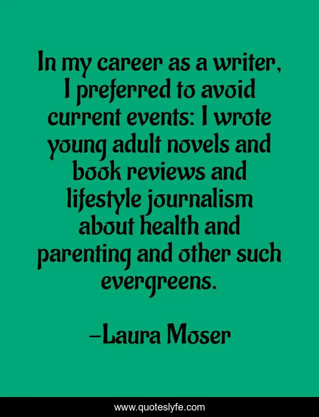 This page presents the quote "In my career as a writer, I preferred to avoid current events: I wrote young adult novels and book reviews and lifestyle journalism about health and parenting and other such evergreens.". Author of this quote is Laura Moser. This quote is about health, book, journalism,.