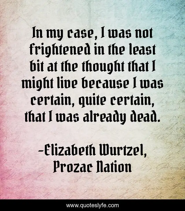 This page presents the quote "In my case, I was not frightened in the least bit at the thought that I might live because I was certain, quite certain, that I was already dead.". Author of this quote is Elizabeth Wurtzel, Prozac Nation. .