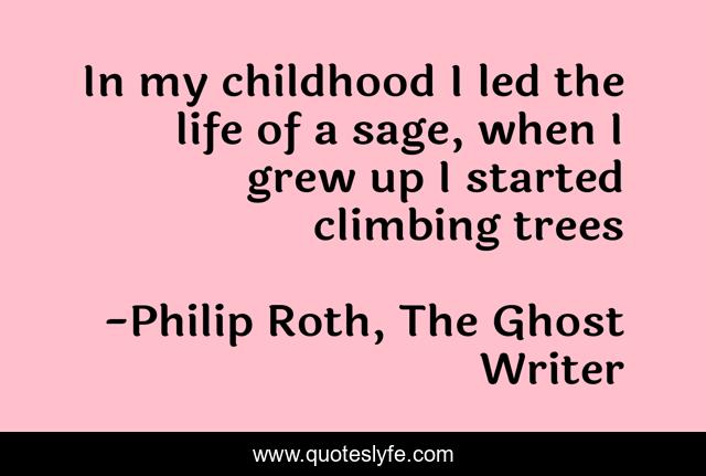 This page presents the quote "In my childhood I led the life of a sage, when I grew up I started climbing trees". Author of this quote is Philip Roth, The Ghost Writer. .