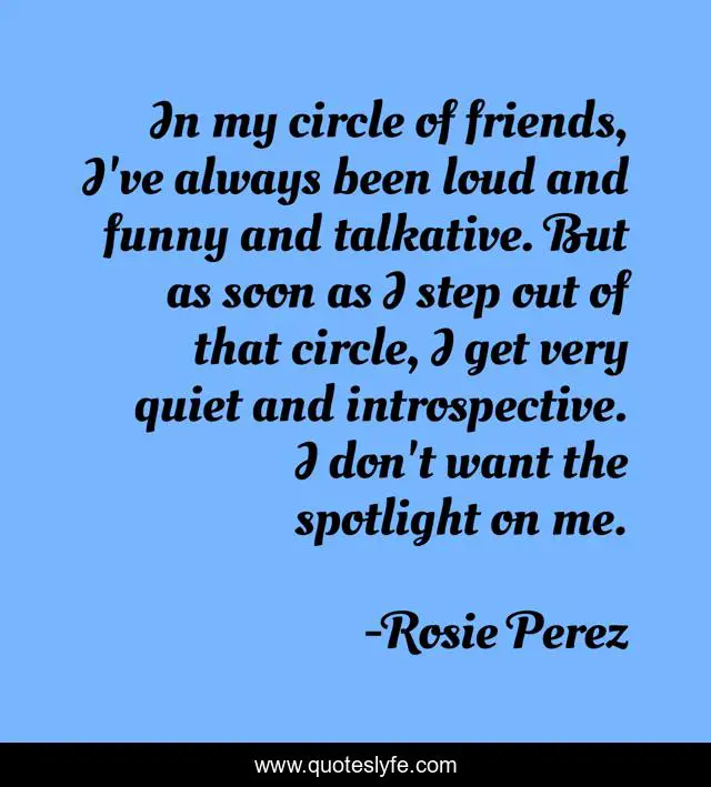 This page presents the quote "In my circle of friends, I've always been loud and funny and talkative. But as soon as I step out of that circle, I get very quiet and introspective. I don't want the spotlight on me.". Author of this quote is Rosie Perez. This quote is about me, step, friends,.