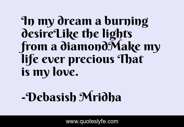 This page presents the quote "In my dream a burning desireLike the lights from a diamondMake my life ever precious That is my love.". Author of this quote is Debasish Mridha. This quote is about life, love, knowledge, inspirational, intelligence, philosophy, wisdom, quotes, affection,.