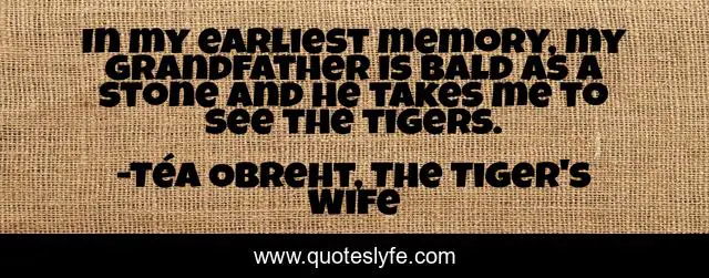 This page presents the quote "In my earliest memory, my grandfather is bald as a stone and he takes me to see the tigers.". Author of this quote is Téa Obreht, The Tiger's Wife. This quote is about tigers, memory,.