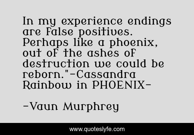 This page presents the quote "In my experience endings are false positives. Perhaps like a phoenix, out of the ashes of destruction we could be reborn."-Cassandra Rainbow in PHOENIX-". Author of this quote is Vaun Murphrey. This quote is about phoenix, adventure, science-fiction,.