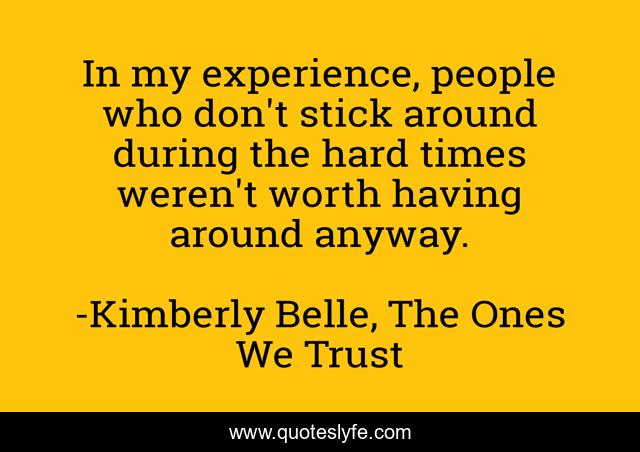 This page presents the quote "In my experience, people who don't stick around during the hard times weren't worth having around anyway.". Author of this quote is Kimberly Belle, The Ones We Trust. This quote is about hard-times, friends,.