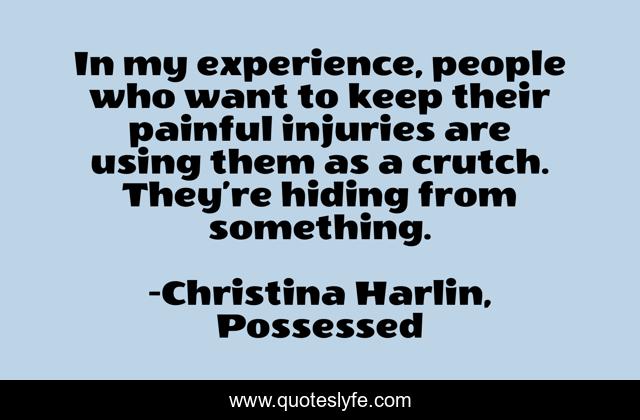 This page presents the quote "In my experience, people who want to keep their painful injuries are using them as a crutch. They’re hiding from something.". Author of this quote is Christina Harlin, Possessed. This quote is about ghost, possession, ghost-hunters, paranormal-romance, haunting, paranormal-thriller,.