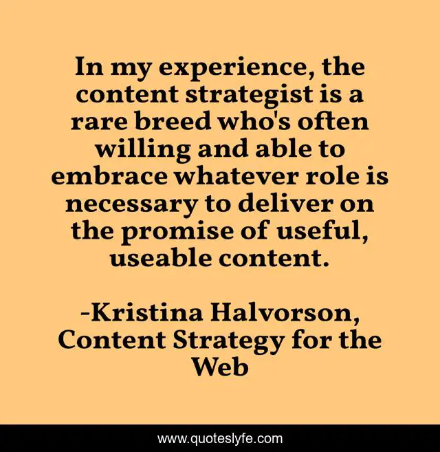 This page presents the quote "In my experience, the content strategist is a rare breed who's often willing and able to embrace whatever role is necessary to deliver on the promise of useful, useable content.". Author of this quote is Kristina Halvorson, Content Strategy for the Web. This quote is about useful, willingness, roles, deliver, strategy, content, promise, role,.