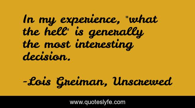 This page presents the quote "In my experience, "what the hell" is generally the most interesting decision.". Author of this quote is Lois Greiman, Unscrewed. This quote is about mystery, chick-lit, humor,.