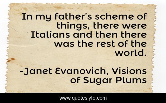 This page presents the quote "In my father’s scheme of things, there were Italians and then there was the rest of the world.". Author of this quote is Janet Evanovich, Visions of Sugar Plums. .