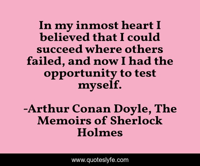 This page presents the quote "In my inmost heart I believed that I could succeed where others failed, and now I had the opportunity to test myself.". Author of this quote is Arthur Conan Doyle, The Memoirs of Sherlock Holmes. This quote is about failure, success, sherlock-holmes,.