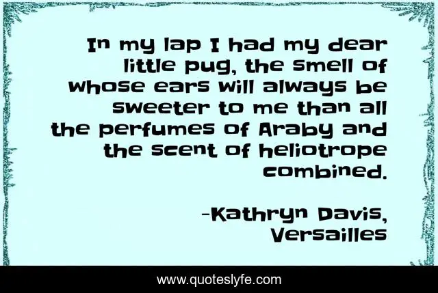 This page presents the quote "In my lap I had my dear little pug, the smell of whose ears will always be sweeter to me than all the perfumes of Araby and the scent of heliotrope combined.". Author of this quote is Kathryn Davis, Versailles. .