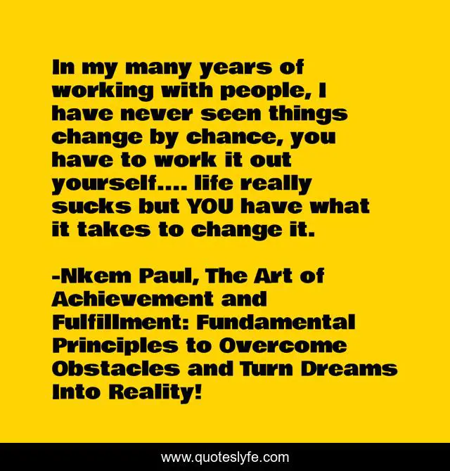 This page presents the quote "In my many years of working with people, I have never seen things change by chance, you have to work it out yourself.... life really sucks but YOU have what it takes to change it.". Author of this quote is Nkem Paul, The Art of Achievement and Fulfillment: Fundamental Principles to Overcome Obstacles and Turn Dreams Into Reality!. This quote is about self-help-books, personal-growth, values-and-bliefs, self-help, personal-development, personal-performance, goal-setting,.