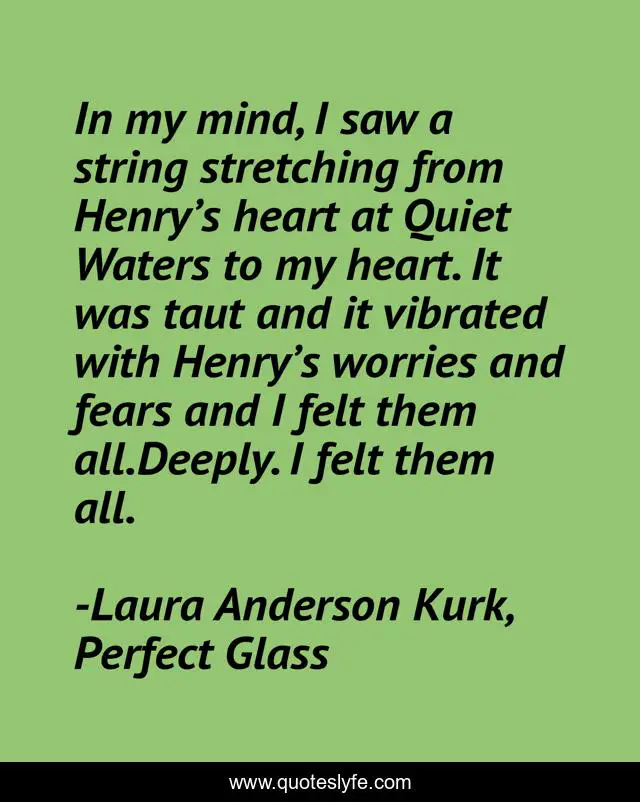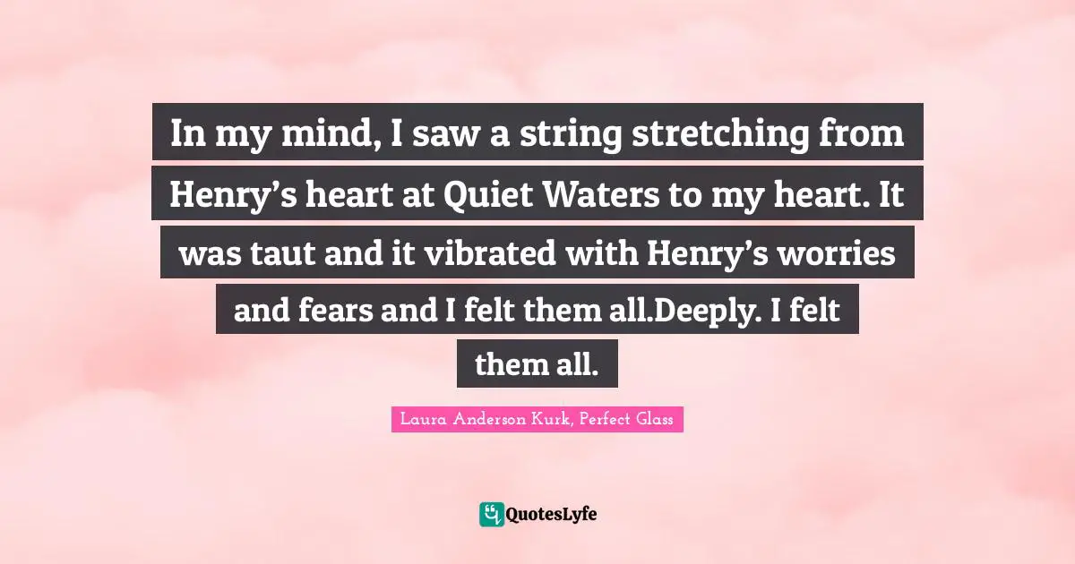This page presents the quote "In my mind, I saw a string stretching from Henry’s heart at Quiet Waters to my heart. It was taut and it vibrated with Henry’s worries and fears and I felt them all.Deeply. I felt them all.". Author of this quote is Laura Anderson Kurk, Perfect Glass. This quote is about glass-girl, orphanage, laura-anderson-kurk, love, college-applications, perfect-glass, meg-kavanagh, romance, wyoming,.