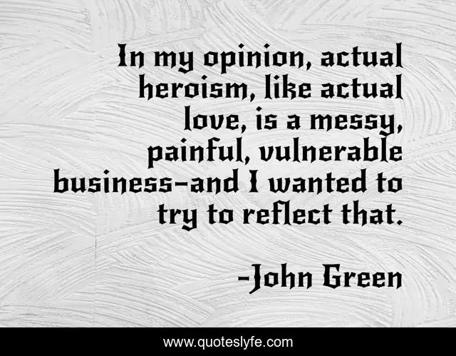 This page presents the quote "In my opinion, actual heroism, like actual love, is a messy, painful, vulnerable business—and I wanted to try to reflect that.". Author of this quote is John Green. This quote is about hero, waters, augustus, heroism, green, john,.