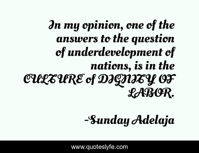 This page presents the quote "In my opinion, one of the answers to the question of underdevelopment of nations, is in the CULTURE of DIGNITY OF LABOR.". Author of this quote is Sunday Adelaja. This quote is about dignity, question, answers, nations, culture, underdevelopment, opinion, labor,.
