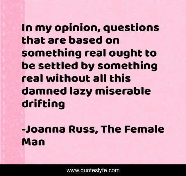 This page presents the quote "In my opinion, questions that are based on something real ought to be settled by something real without all this damned lazy miserable drifting". Author of this quote is Joanna Russ, The Female Man. This quote is about feminism, science-fiction,.