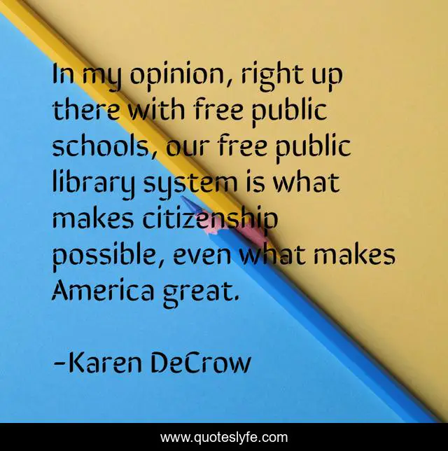 This page presents the quote "In my opinion, right up there with free public schools, our free public library system is what makes citizenship possible, even what makes America great.". Author of this quote is Karen DeCrow. This quote is about america, library, free,.