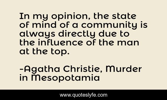 This page presents the quote "In my opinion, the state of mind of a community is always directly due to the influence of the man at the top.". Author of this quote is Agatha Christie, Murder in Mesopotamia. This quote is about leadership, influence, community,.