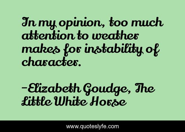 This page presents the quote "In my opinion, too much attention to weather makes for instability of character.". Author of this quote is Elizabeth Goudge, The Little White Horse. This quote is about character, weather, humor,.