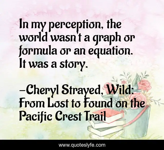 This page presents the quote "In my perception, the world wasn't a graph or formula or an equation. It was a story.". Author of this quote is Cheryl Strayed, Wild: From Lost to Found on the Pacific Crest Trail. This quote is about perception, narrative,.