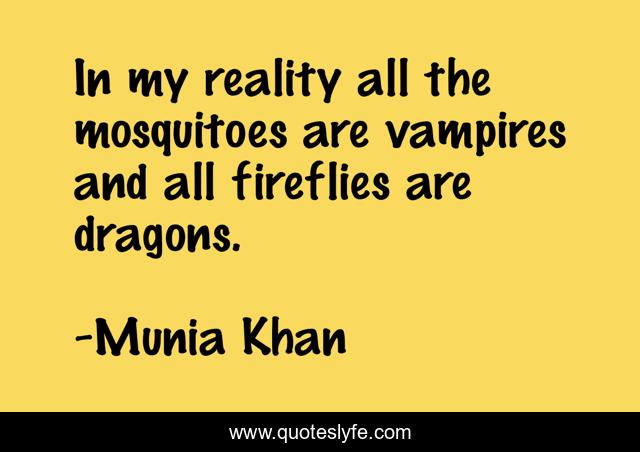 This page presents the quote "In my reality all the mosquitoes are vampires and all fireflies are dragons.". Author of this quote is Munia Khan. This quote is about reality-of-life, vampires, dracula, vampire, reality, mosquito, dragons,.