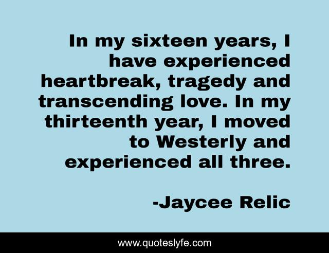 This page presents the quote "In my sixteen years, I have experienced heartbreak, tragedy and transcending love. In my thirteenth year, I moved to Westerly and experienced all three.". Author of this quote is Jaycee Relic. This quote is about love, redemption, heartbreak, child, tragedy, affection,.