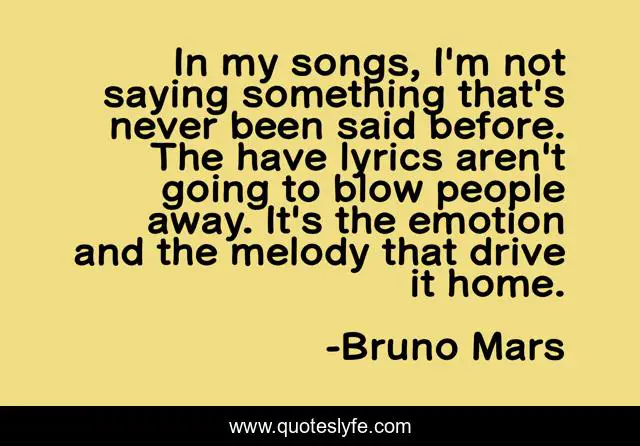 This page presents the quote "In my songs, I'm not saying something that's never been said before. The have lyrics aren't going to blow people away. It's the emotion and the melody that drive it home.". Author of this quote is Bruno Mars. This quote is about emotion, saying, people,.