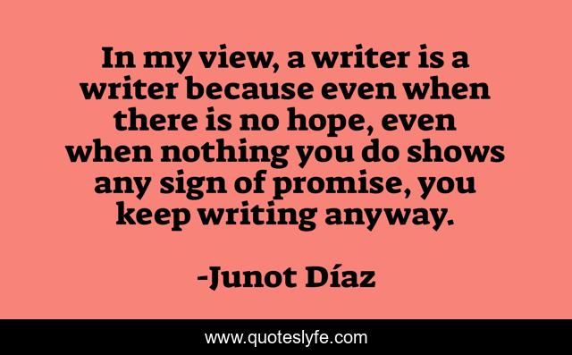 This page presents the quote "In my view, a writer is a writer because even when there is no hope, even when nothing you do shows any sign of promise, you keep writing anyway.". Author of this quote is Junot Díaz. This quote is about literature, writers, writing,.