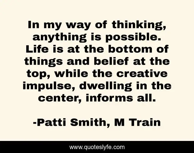 This page presents the quote "In my way of thinking, anything is possible. Life is at the bottom of things and belief at the top, while the creative impulse, dwelling in the center, informs all.". Author of this quote is Patti Smith, M Train. This quote is about life, m-train, possible, impulse, patti-smith,.