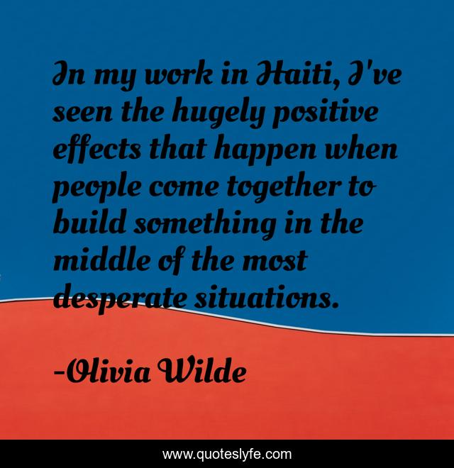 This page presents the quote "In my work in Haiti, I've seen the hugely positive effects that happen when people come together to build something in the middle of the most desperate situations.". Author of this quote is Olivia Wilde. This quote is about work, together, people,.
