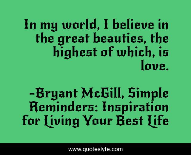 This page presents the quote "In my world, I believe in the great beauties, the highest of which, is love.". Author of this quote is Bryant McGill, Simple Reminders: Inspiration for Living Your Best Life. This quote is about beauty, love, beliefs, affection, highness,.