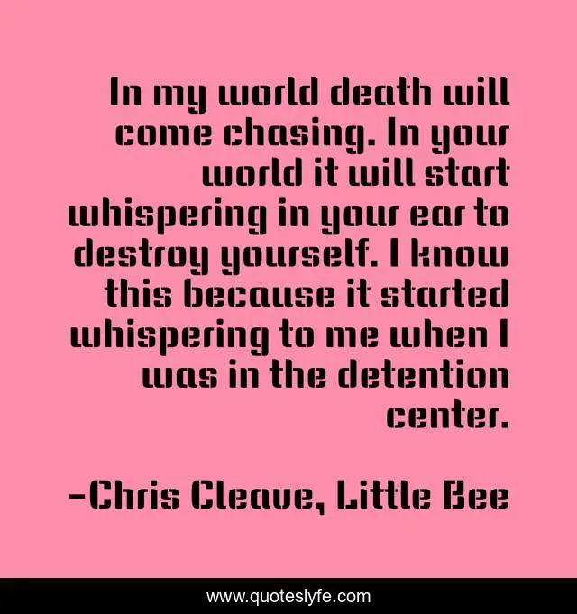 This page presents the quote "In my world death will come chasing. In your world it will start whispering in your ear to destroy yourself. I know this because it started whispering to me when I was in the detention center.". Author of this quote is Chris Cleave, Little Bee. .