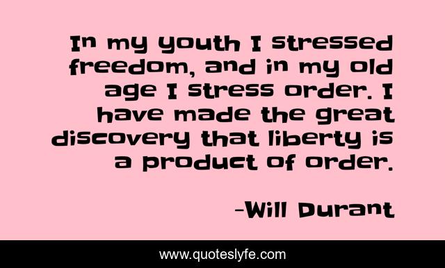 This page presents the quote "In my youth I stressed freedom, and in my old age I stress order. I have made the great discovery that liberty is a product of order.". Author of this quote is Will Durant. This quote is about freedom, stress, great,.