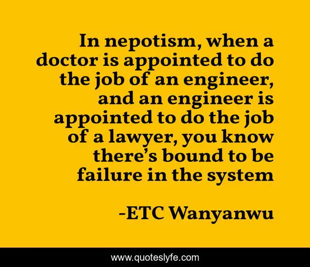This page presents the quote "In nepotism, when a doctor is appointed to do the job of an engineer, and an engineer is appointed to do the job of a lawyer, you know there’s bound to be failure in the system". Author of this quote is ETC Wanyanwu. This quote is about politics, government,.