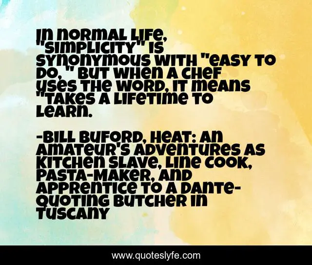 "Bill Buford, Heat: An Amateur's Adventures as Kitchen Slave, Line Cook, Pasta-Maker, and Apprentice to a Dante-Quoting Butcher in Tuscany Quotes." Quoteslyfe.com, 2025. Fri. 05 Dec. 2025. <https://www.quoteslyfe.com/quote/In-normal-life-simplicity-is-synonymous-with-117531>.