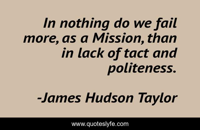 This page presents the quote "In nothing do we fail more, as a Mission, than in lack of tact and politeness.". Author of this quote is James Hudson Taylor. This quote is about politeness, mission,.