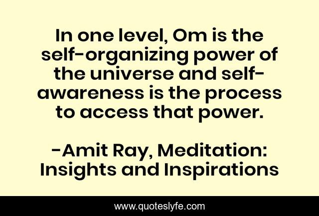 This page presents the quote "In one level, Om is the self-organizing power of the universe and self-awareness is the process to access that power.". Author of this quote is Amit Ray, Meditation: Insights and Inspirations. This quote is about self-organizing-power, om-meditation, om, self-awareness, self-organizing,.