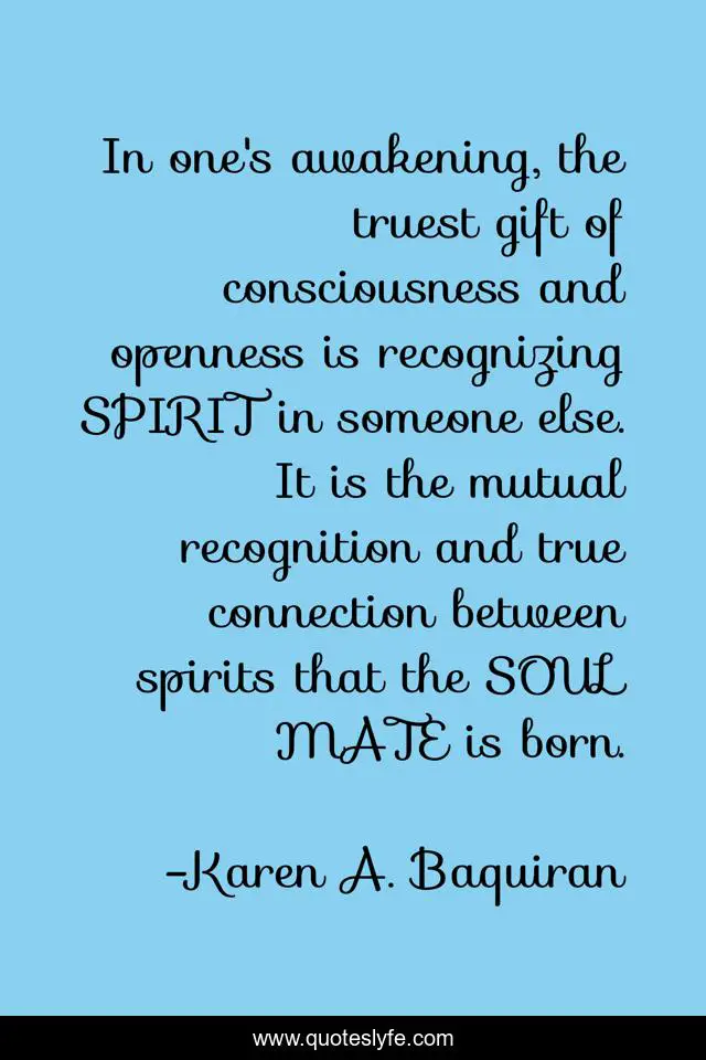 This page presents the quote "In one's awakening, the truest gift of consciousness and openness is recognizing SPIRIT in someone else. It is the mutual recognition and true connection between spirits that the SOUL MATE is born.". Author of this quote is Karen A. Baquiran. This quote is about gratitude, love, consciousness, soulconnection, loveyourselfmovement, loveyourself, soulate, friendship, affection,.