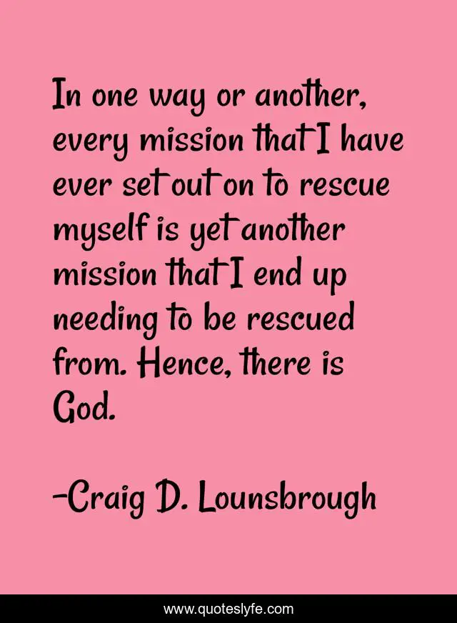 This page presents the quote "In one way or another, every mission that I have ever set out on to rescue myself is yet another mission that I end up needing to be rescued from. Hence, there is God.". Author of this quote is Craig D. Lounsbrough. This quote is about retrieve, prideful, rescue-mission, christianity, arrogant, narcissistic, selfish, god, arrogance,.