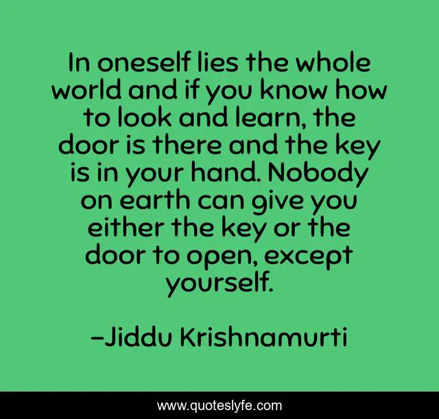 This page presents the quote "In oneself lies the whole world and if you know how to look and learn, the door is there and the key is in your hand. Nobody on earth can give you either the key or the door to open, except yourself.". Author of this quote is Jiddu Krishnamurti. This quote is about world, door, yourself,.